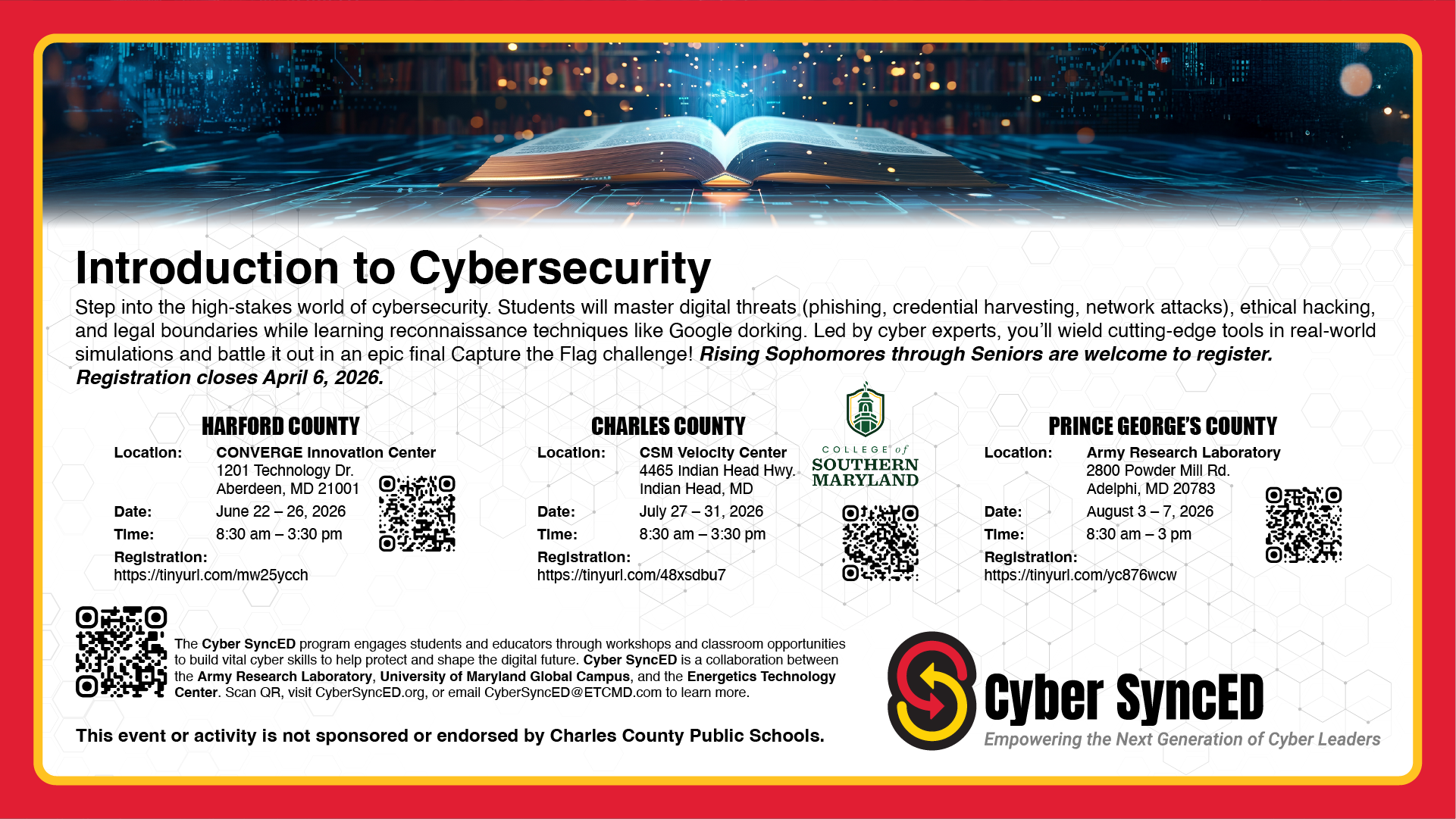 Step into the high-stakes world of cybersecurity. Students will master digital threats (phishing, credential harvesting, network attacks), ethical hacking, and legal boundaries while learning reconnaissance techniques like Google dorking. Led by cyber experts, you’ll wield cutting-edge tools in real-world simulations and battle it out in an epic final Capture the Flag challenge! Rising Sophomores, Juniors, and Seniors are welcome to register. Registration closes April 6, 2026.